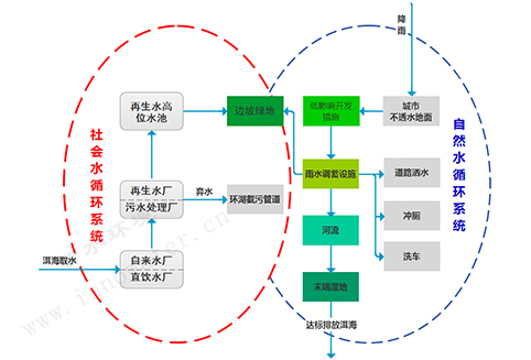 健康水循環(huán)是指在充分認(rèn)識(shí)水資源是基礎(chǔ)性的自然資源和戰(zhàn)略性的經(jīng)濟(jì)資源、是生態(tài)環(huán)境的控制性要素的前提下,將水資源的高效利用和有效保護(hù)作為首要目標(biāo),有機(jī)連通水資源的自然循環(huán)和社會(huì)循環(huán)的二元循環(huán)過程,將水資源的利用模式從傳統(tǒng)的“取水-輸水-用戶-排放”的單向開放式流動(dòng),轉(zhuǎn)變?yōu)?/span>“節(jié)制地取水-輸水-用戶-再生水”的反饋式循環(huán)流程。具體地說,是在一個(gè)地區(qū)充分尊重水的自然運(yùn)動(dòng)規(guī)律,合理科學(xué)地使用水資源,同時(shí)對(duì)廢水進(jìn)行再生凈化,實(shí)現(xiàn)“優(yōu)水優(yōu)用、分質(zhì)供水”,從而維系或恢復(fù)城市乃至流域的良好水環(huán)境,實(shí)現(xiàn)水資源的可持續(xù)利用。