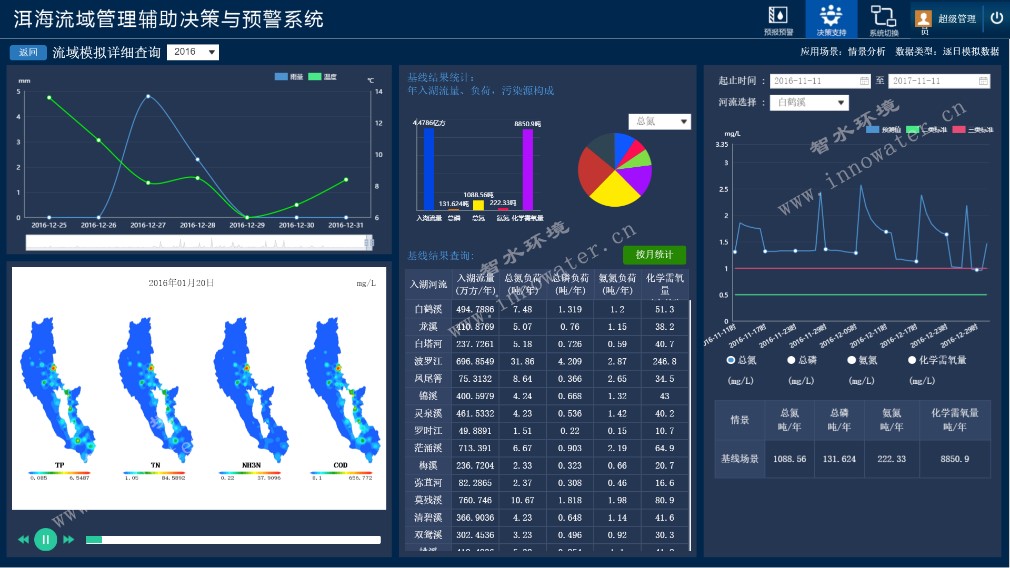 緊緊圍繞“一定要保護(hù)好洱?!?/strong>這個(gè)中心主題,在國(guó)家環(huán)保部和省環(huán)保廳的大力支持下,洱海監(jiān)控預(yù)警系統(tǒng)自2017年開(kāi)始建設(shè),目前已經(jīng)完成了一期的建設(shè)任務(wù)。系統(tǒng)包括三個(gè)主要的部分:前端的水環(huán)境監(jiān)測(cè)系統(tǒng)(北京大恒承建)、基于“一張圖”的業(yè)務(wù)應(yīng)用系統(tǒng)平臺(tái)(福建四創(chuàng)承建)、以及核心的決策支持模型體系(北京英特-南京智水團(tuán)隊(duì)承建)。系統(tǒng)有效整合分散于流域內(nèi)氣象、水文、環(huán)保、國(guó)土、規(guī)劃、旅游、農(nóng)業(yè)等各個(gè)部門(mén)的數(shù)據(jù),為決策者提供“一站式”的綜合信息服務(wù)(數(shù)字洱海),將基礎(chǔ)數(shù)據(jù)作為流域模型體系的輸入,厘清流域內(nèi)主要污染物的來(lái)源和時(shí)空分布,以及在湖體內(nèi)的遷移轉(zhuǎn)化過(guò)程(透明洱海),進(jìn)而為洱海湖體的水質(zhì)短期預(yù)警和長(zhǎng)效管控治理提供決策支持(智慧洱海)。