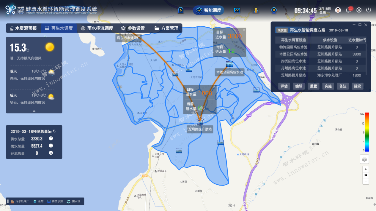 2)預報預測功能,根據(jù)未來3-7天的天氣預報,預測新區(qū)的生態(tài)需水量、地表徑流量、和再生水量,作為調(diào)度的基礎(chǔ);