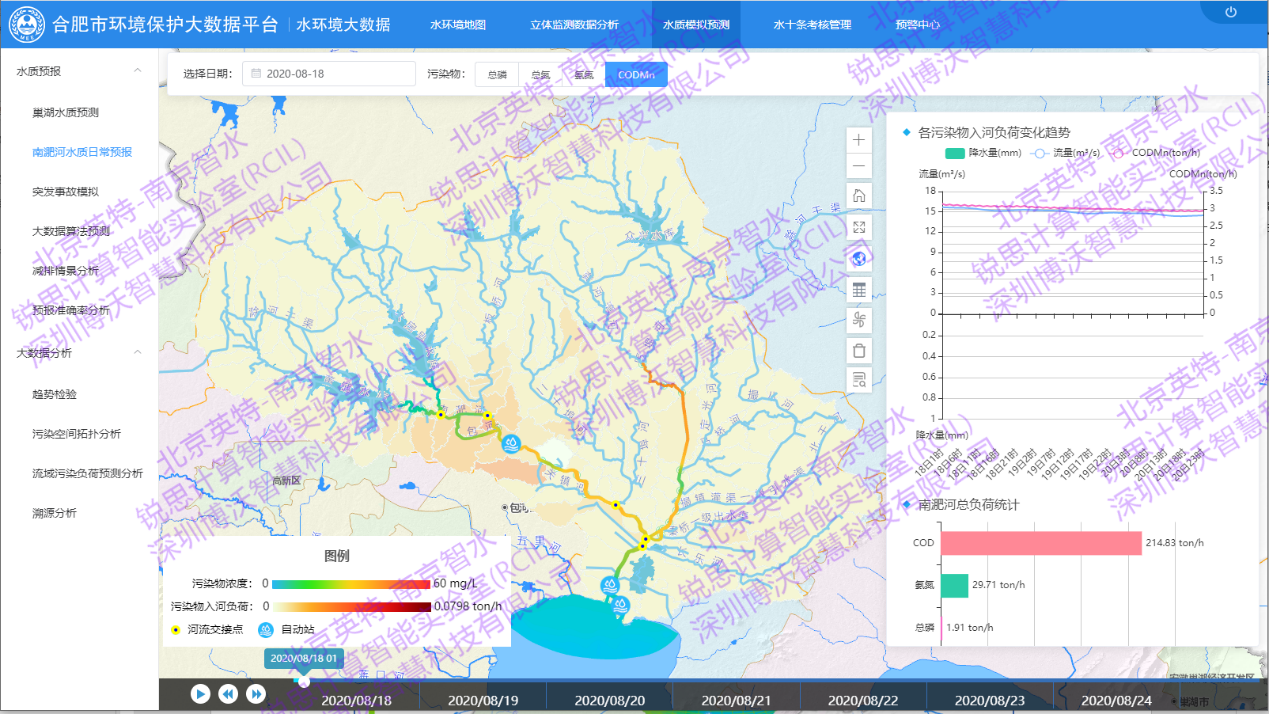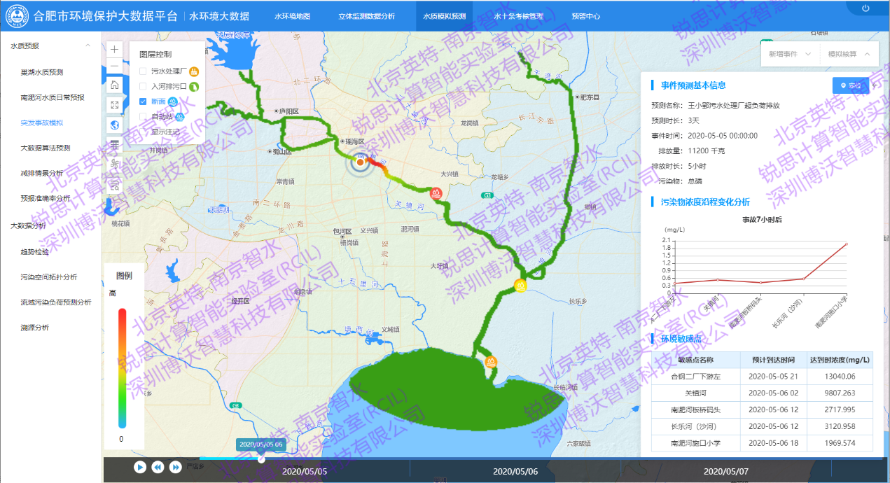 作為合肥市的母親河,基于南淝河流域水文水質(zhì)模型與南淝河復(fù)雜高分辨率水動(dòng)力水質(zhì)模型耦合的水環(huán)境模型體系,對(duì)未來3天的陸域產(chǎn)生的負(fù)荷動(dòng)態(tài)變化和南淝河水質(zhì)濃度變化的空間聯(lián)動(dòng)過程進(jìn)行預(yù)測(cè)預(yù)警;同時(shí),基于影響南淝河水質(zhì)可能的風(fēng)險(xiǎn)源,實(shí)現(xiàn)對(duì)總氮、總磷、化學(xué)需氧量和氨氮、氟化物、持久性污染物以及油類污染物的多種污染源突發(fā)性風(fēng)險(xiǎn)事故建模,動(dòng)態(tài)模擬污染物的降解沉降過程,展示事故后污染物在南淝河的遷移擴(kuò)散,污染物時(shí)空分布特征,分析污染物對(duì)下游重要斷面、水源地的影響時(shí)間、影響程度。從而將突發(fā)事故處置過程由被動(dòng)轉(zhuǎn)為主動(dòng),科學(xué)輔助管理部門針對(duì)突發(fā)性水污染事故做出應(yīng)急指揮。