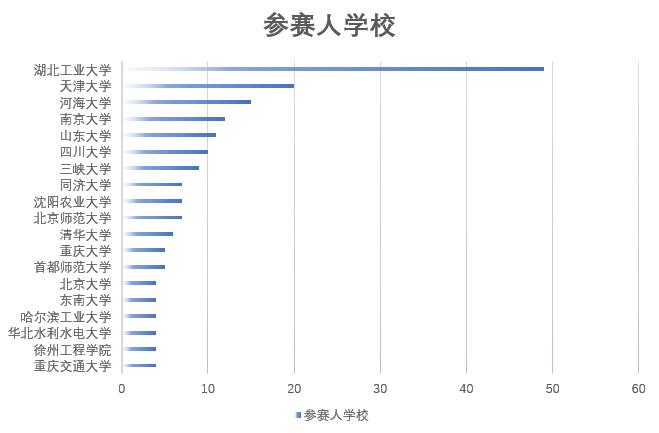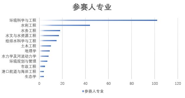截至2019年10月16日,第二屆全國大學(xué)生水環(huán)境模型模擬大賽已圓滿落幕。本次大賽共得到了來自63所高校近300名同學(xué)的積極響應(yīng),其中參賽人數(shù)最多的是湖北工業(yè)大學(xué),共有49人參賽,其它參賽人數(shù)較多的大學(xué)還包括河海大學(xué)、山東大學(xué)和三峽大學(xué)等(圖1);參賽選手所屬的專業(yè)方向共20個,其中環(huán)境科學(xué)與工程(102人)與水利工程(44人)方向的參賽同學(xué)占主導(dǎo)(圖2)。