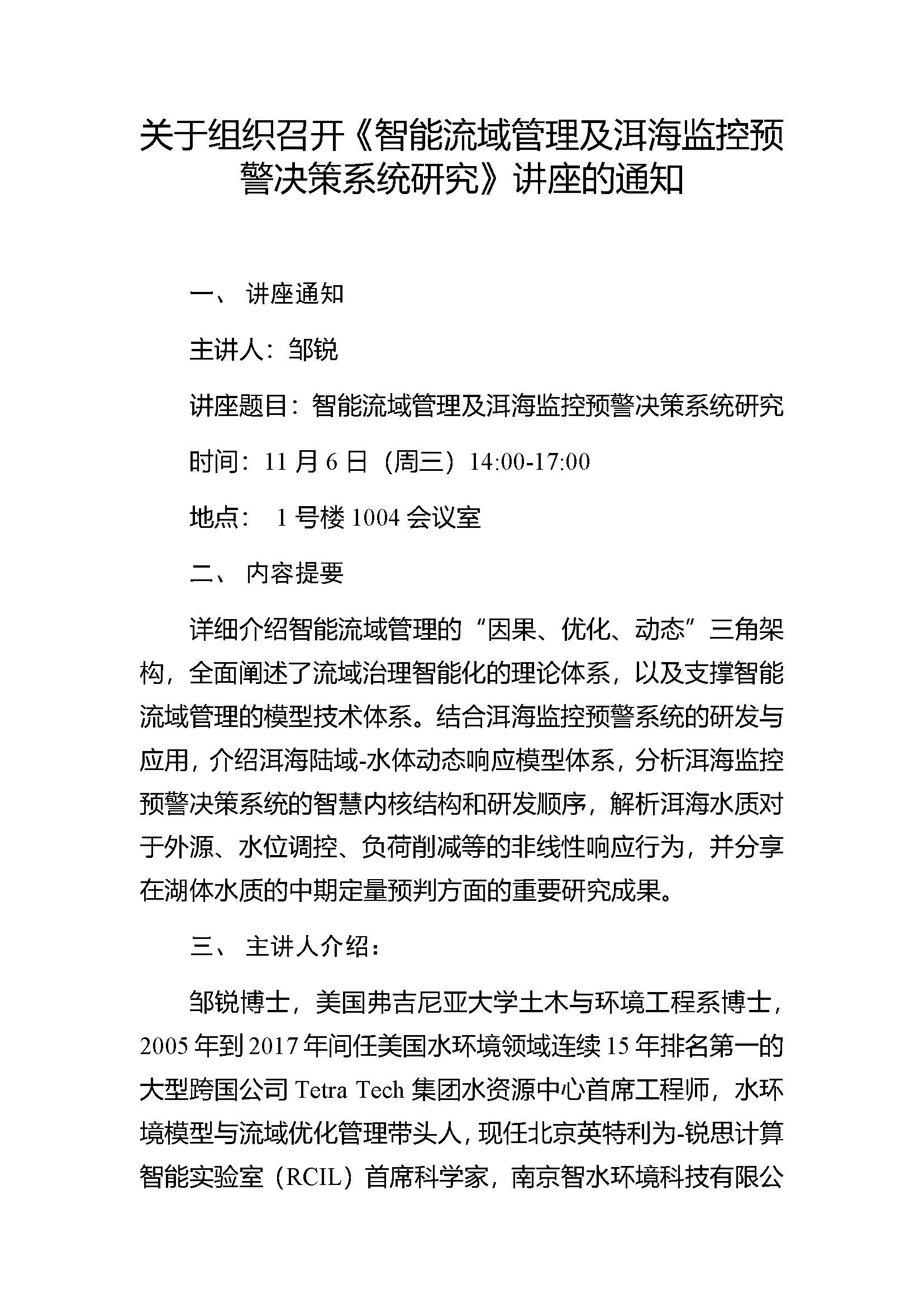 2019年11月6日下午,北京英特-南京智水首席科學(xué)家鄒銳博士將應(yīng)邀赴中國環(huán)境科學(xué)研究院進(jìn)行題為“智能流域管理及洱海監(jiān)控預(yù)警決策系統(tǒng)研究”的學(xué)術(shù)報(bào)告,歡迎有意參加的研究人員提前報(bào)名。